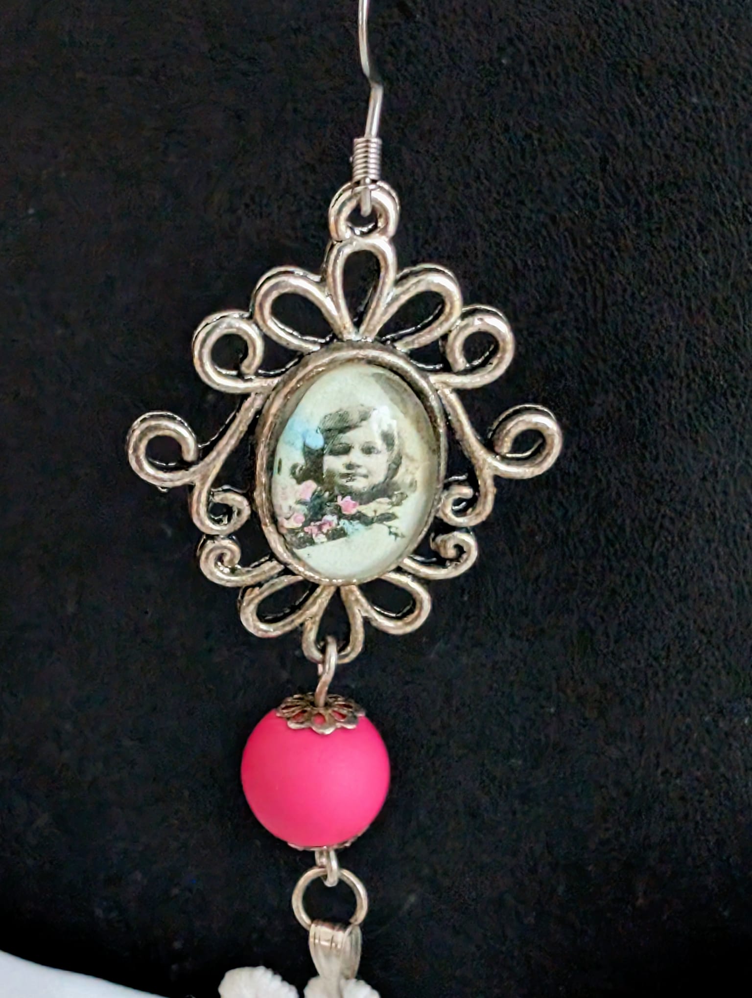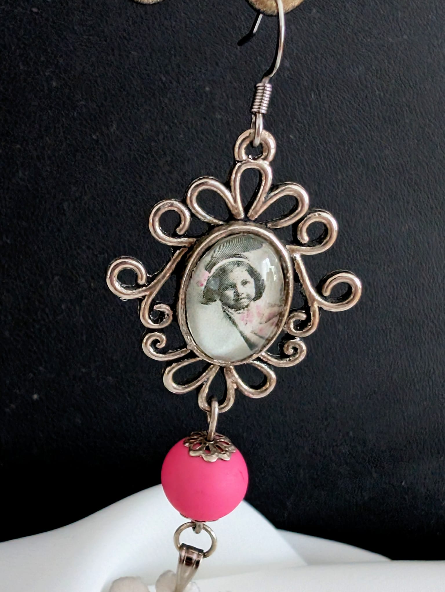 Design : Boucles d’oreilles composées d’un médaillon fait à partir d’une carte postale ancienne, surmontant une perle rose fuchsia et une fleur en dentelle.