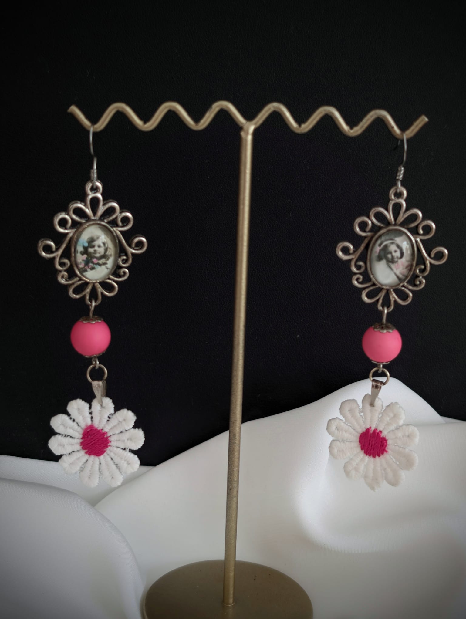 Cette paire de boucles d’oreilles ne se contente pas d’être un accessoire. Elle mélange deux univers : le charme d’un portrait vintage qui rappelle nos racines, et une fleur en dentelle boostée par une perle rose fuchsia très actuelle.